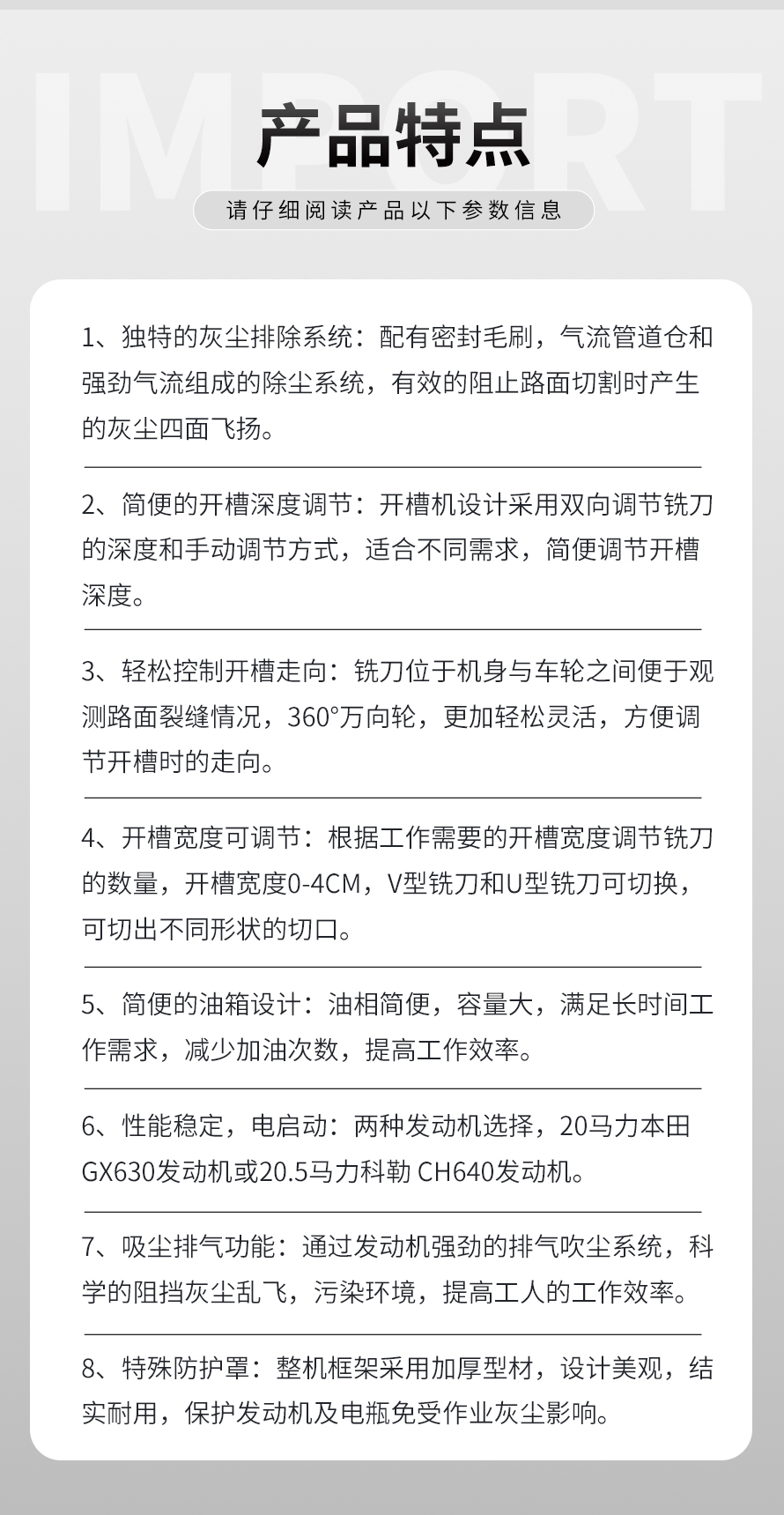 適用于瀝青路面灌縫修補(bǔ)前的裂縫打?qū)?。該設(shè)備具有使用方便,擴(kuò)縫速度快,刀片使用壽命長(zhǎng),擴(kuò)縫寬度可調(diào)等優(yōu)點(diǎn)