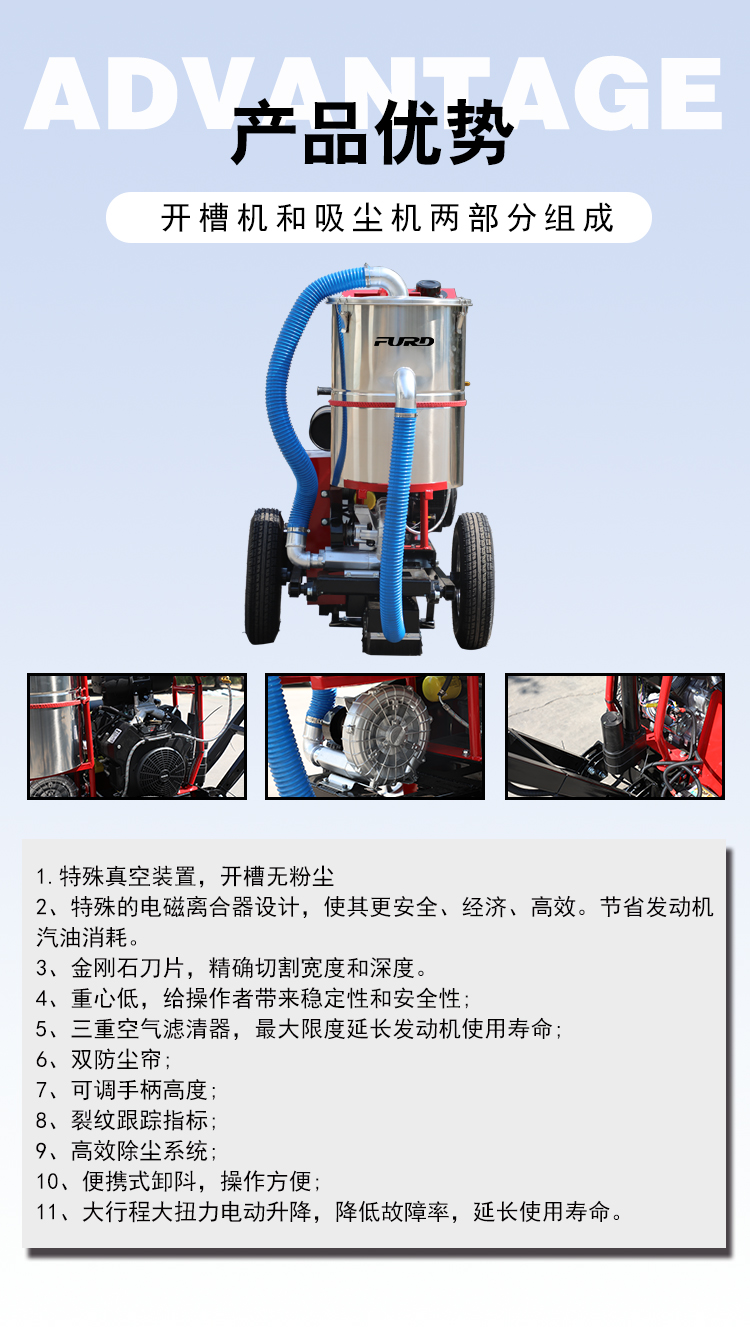 自吸塵式路面開槽機主要用于瀝青路面修補裂縫開槽的機械,其集吸塵、開槽為一體,環(huán)保性好,工作效果高,是路面開槽施工不錯的選擇。